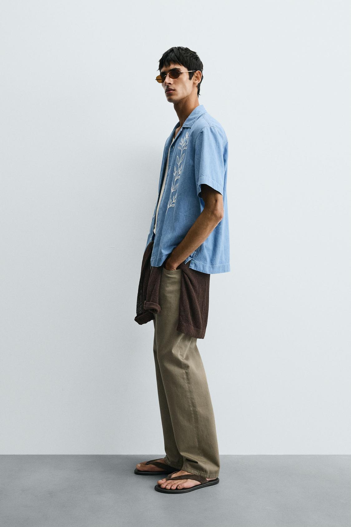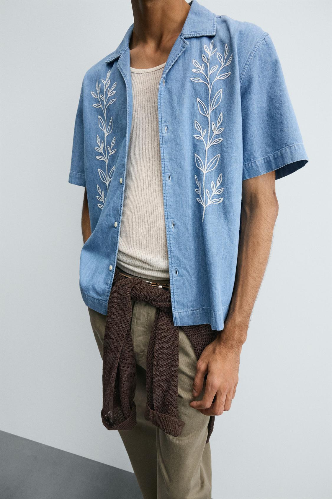 Crafted in a soft denim-blue tone, this shirt features delicate white leaf embroidery on both sides, giving it a fresh, natural aesthetic perfect for laid-back days or casual evenings.
